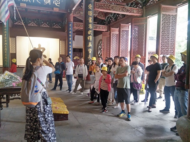 青石鋪成的甬道,參天的古木,屋檐正中懸掛的“岳王廟”三個大字莊嚴巍峨。大殿的正中,身著紫色蟒袍的岳飛塑像,友高人仔細聆聽關(guān)于岳飛生平的介紹,讓友高人接受到了愛國主義教育,學習岳飛精神。